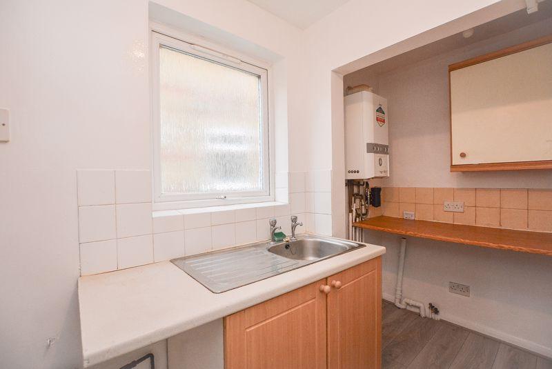 Accessed from the studio, there is a 'L' shaped kitchen. With wood effect flooring and painted walls, this space is comprised of eye level and low level units that provide storage, plumbing access and house amenities such as a sink with dryer unit. Complete with splashback wall tiling and a double glazed, obscured window towards the side elevation.