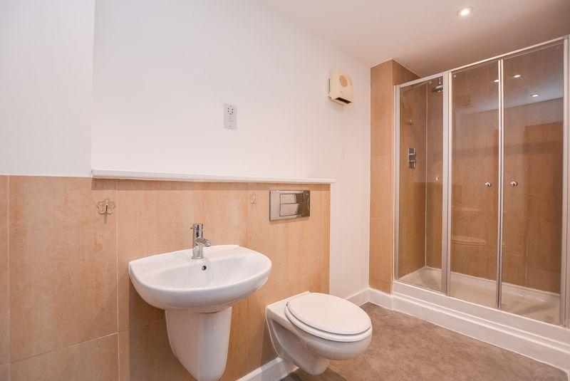 Large en-suite shower room comprising of a double shower cubicle with mains shower, wall mounted WC and wash hand basin. Vinyl flooring and plastered ceiling with recessed spot lighting.