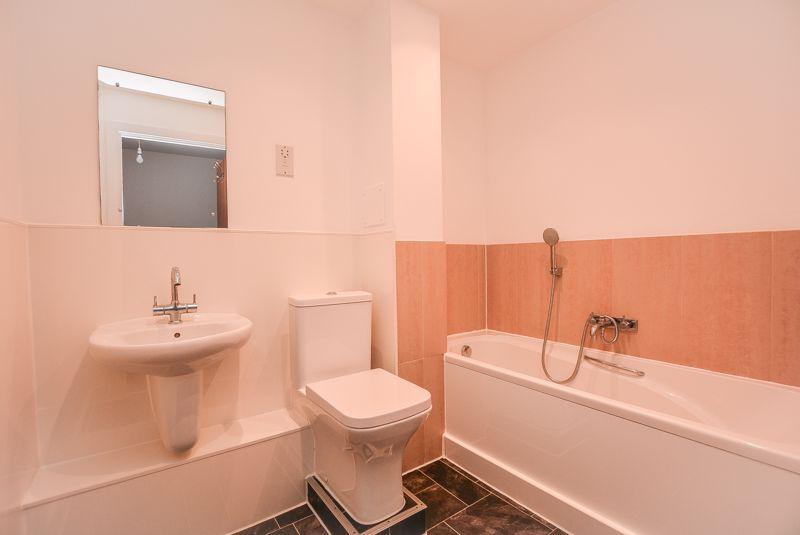 Suite comprising of a panelled bath, WC and wall mounted wash hand basin. Tiled effect vinyl flooring and plastered ceiling with recessed spot lighting.