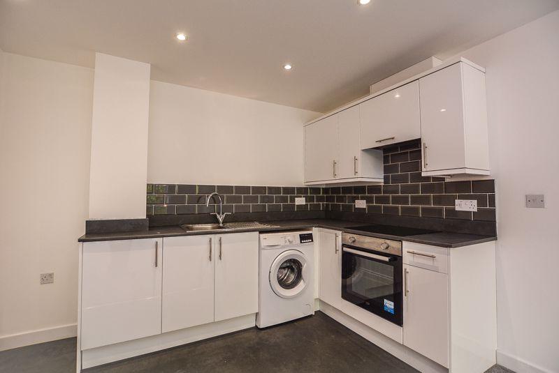 Selection of base and drawer units with a complimentary black worktop. Inset stainless steel sink and drainer unit with mixer tap. Built in electric oven and hob with extractor fan above. Further selection of matching eye level units, plumbing for a washing and plastered ceiling with recessed spot lighting.