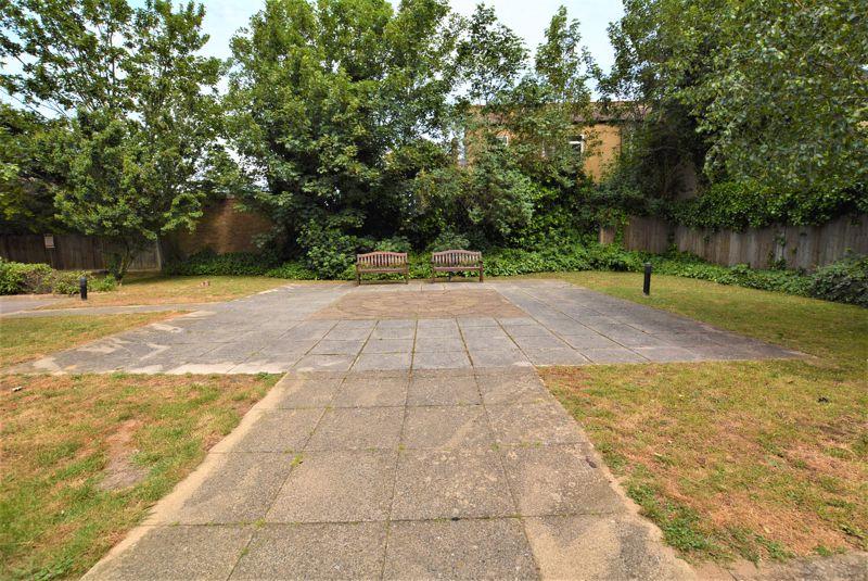 Mature communal gardens with patio seating area, lawns and a selection of small trees.