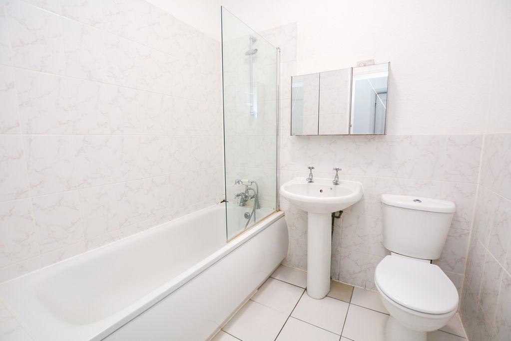 Accessed from the entrance hallway, there is a three piece bathroom. Comprised of a low level W/C, a paneled bath, wall mounted shower, shower screen and pedestal hand wash basin, this space benefits from splashback wall tiling and tiled effect flooring