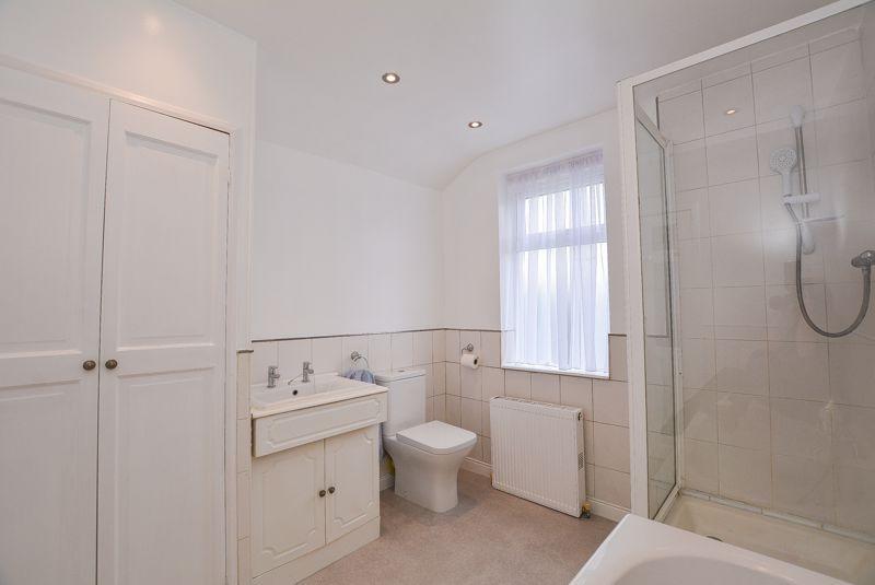 Accessed via the first floor landing, there is a four piece family bathroom. Enviable for it's bright presentation, this space is comprised of a paneled bath, a wall mounted shower, a low level W/C as well as a mixer tap basin paired with a vanity unit. With a built in cupboard that houses the boiler, this area benefits from a double glazed window towards the rear elevation of the property as well as splashback wall tiling, a fitted radiator and recessed spot lighting.