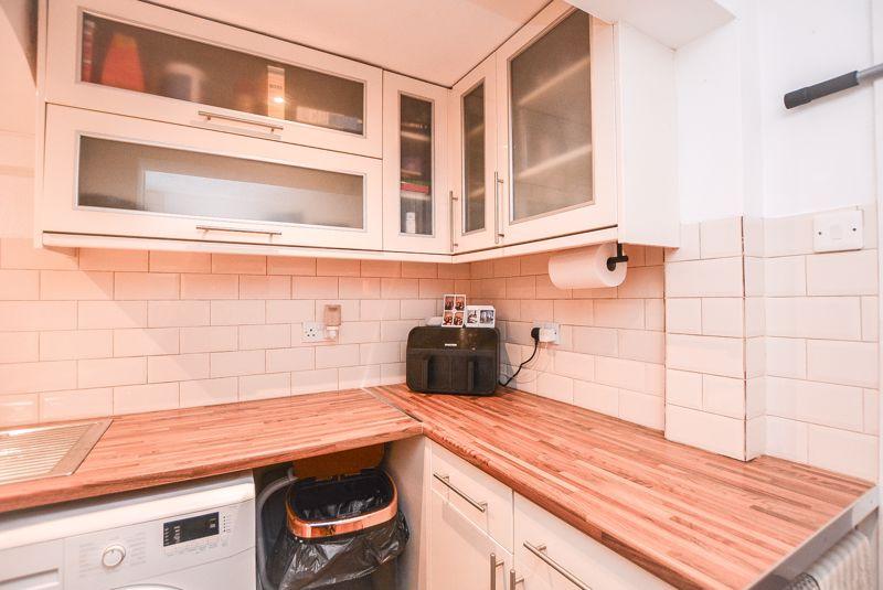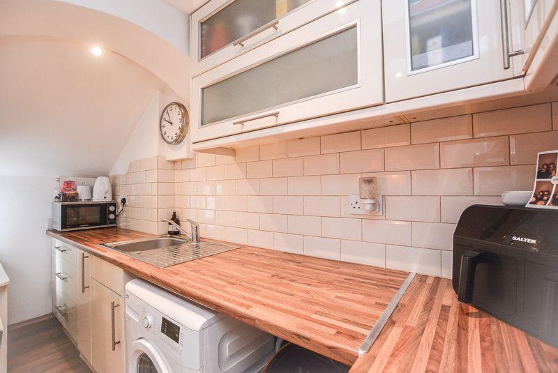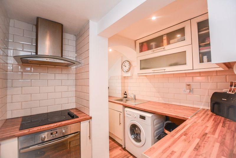 Accessed from the lounge, there is a warm toned kitchen. With wood effect flooring and matching wood effect counter tops, this space is comprised of both eye level and low level storage units that provides ample storage, whilst housing amenities such as an inset oven, hob, sink and extractor. Finished with recessed spot lighting, splashback wall tiling and a window towards the side elevation.