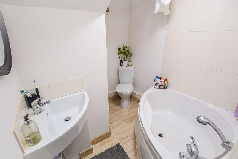 Accessed from the rear lobby, there is a three piece bathroom. Finished with tiled flooring and matching splashback wall tiling, this space is comprised of a corner bath with shower head attachment, shower curtain, low level W/C and wall mounted hand wash basin. Additional benefits include an extractor as well as a fitted radiator.