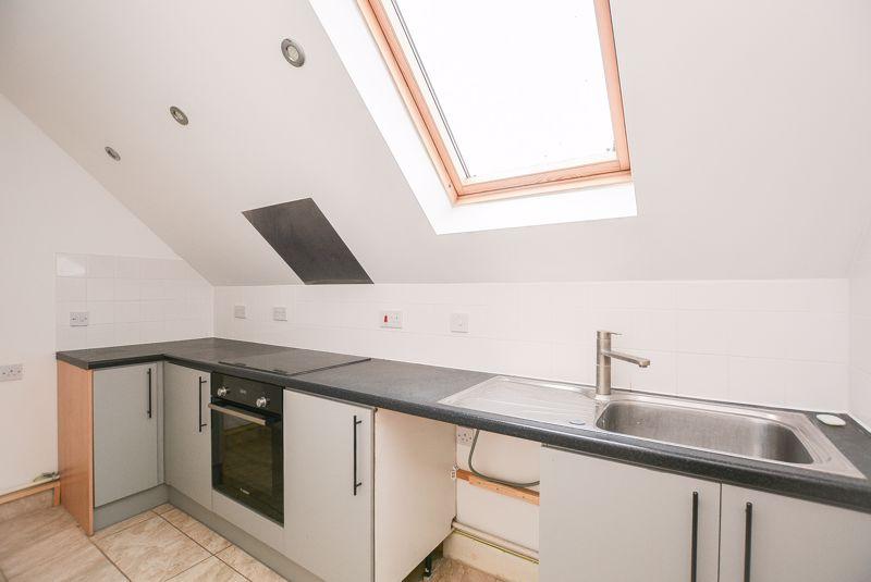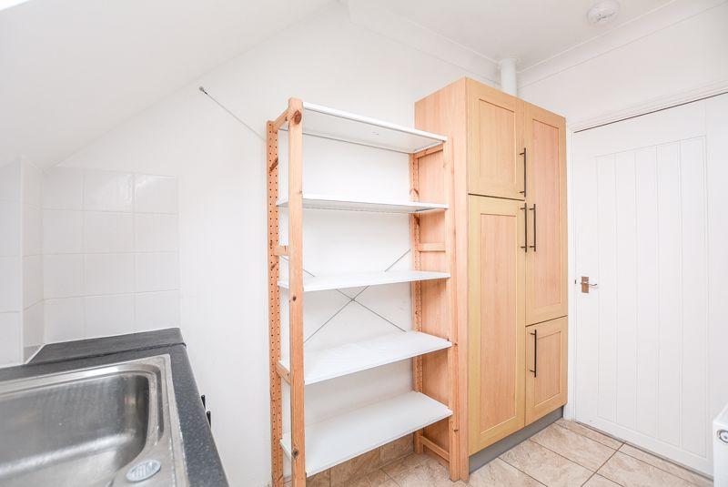 Accessed from the private entrance hallway, there is a kitchen. With tiled flooring and painted walls, this space is comprised of low level storage units that house amenities such as a sink with dryer unit and plumbing for utilities. Complete with a fitted radiator, recessed spot lighting, splashback wall tiling and a double glazed velux window.