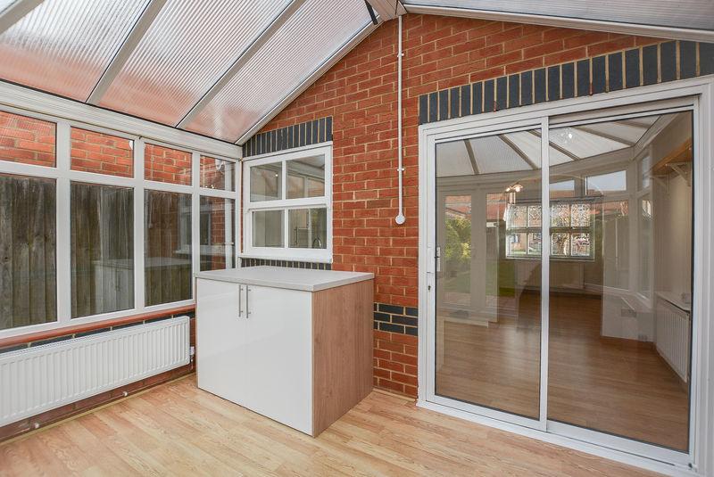 Accessed from the kitchen diner, there is a generously sized conservatory. With wood effect flooring and brick walls, this space looks into the thriving rear gardens via double glazed windows as well as a set of double glazed french doors. Additional benefits include electric access, lighting and plumbing access for utilities.