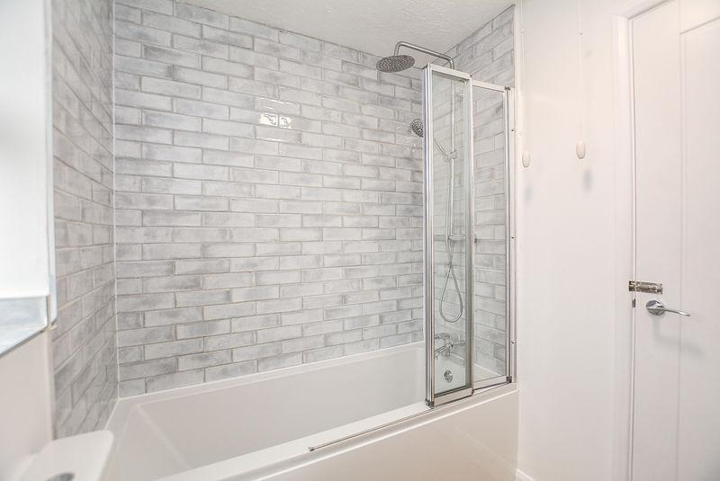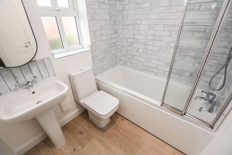Accessed from the first floor landing, there is a modern, three piece bathroom suite. Comprised of a low level W/C, a pedestal hand wash basin, a paneled bath, wall mounted shower alongside rainfall shower and folding shower screen, this space also benefits from a mirrored storage unit, a heated towel rail and a double glazed, obscured window towards the rear elevation. Complete with wood effect flooring, painted walls and splashback wall tiling.