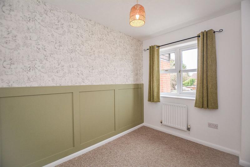 Accessed from the first floor landing, there is a secondary bedroom. With carpet flooring, this space benefits from decorative features such as wood paneling and a bespoke wallpaper feature wall. Complete with a fitted radiator and a double glazed window towards the rear elevation.