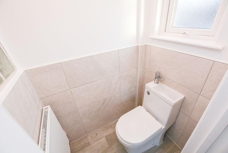 From the master bedroom, you have access to an en-suite W/C. With painted walls, this space is comprised of a low level W/C and integrated sink. Complete with splashback wall tiling, matching tiled flooring, a fitted radiator and a double glazed, obscured window towards the front elevation.