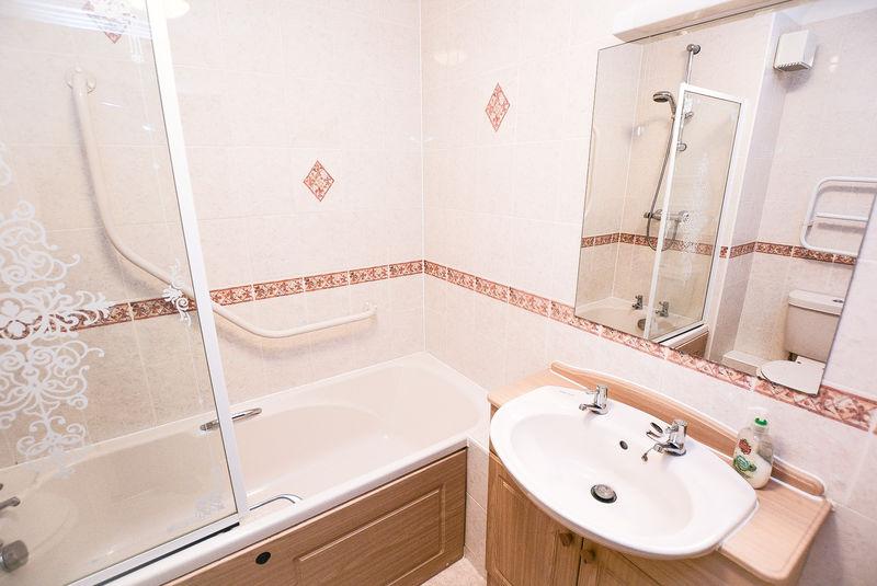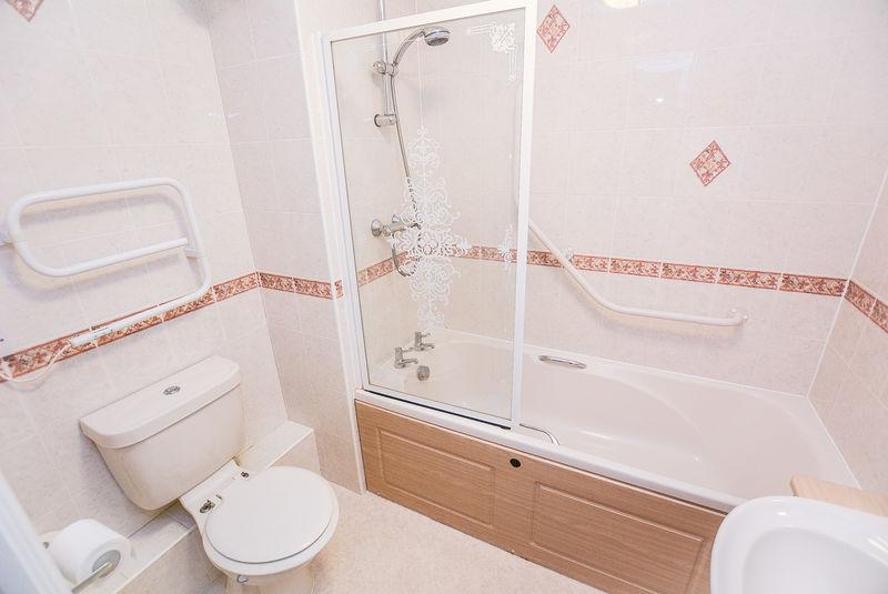 Accessed from the entrance hallway, there is a three piece bathroom. Comprised of a low level W/C, a paneled bath, a wall mounted shower, a shower screen and a hand wash basin with vanity unit, this space is complete with tiled walls and wall mounted assistance hand rails to support mobility.
