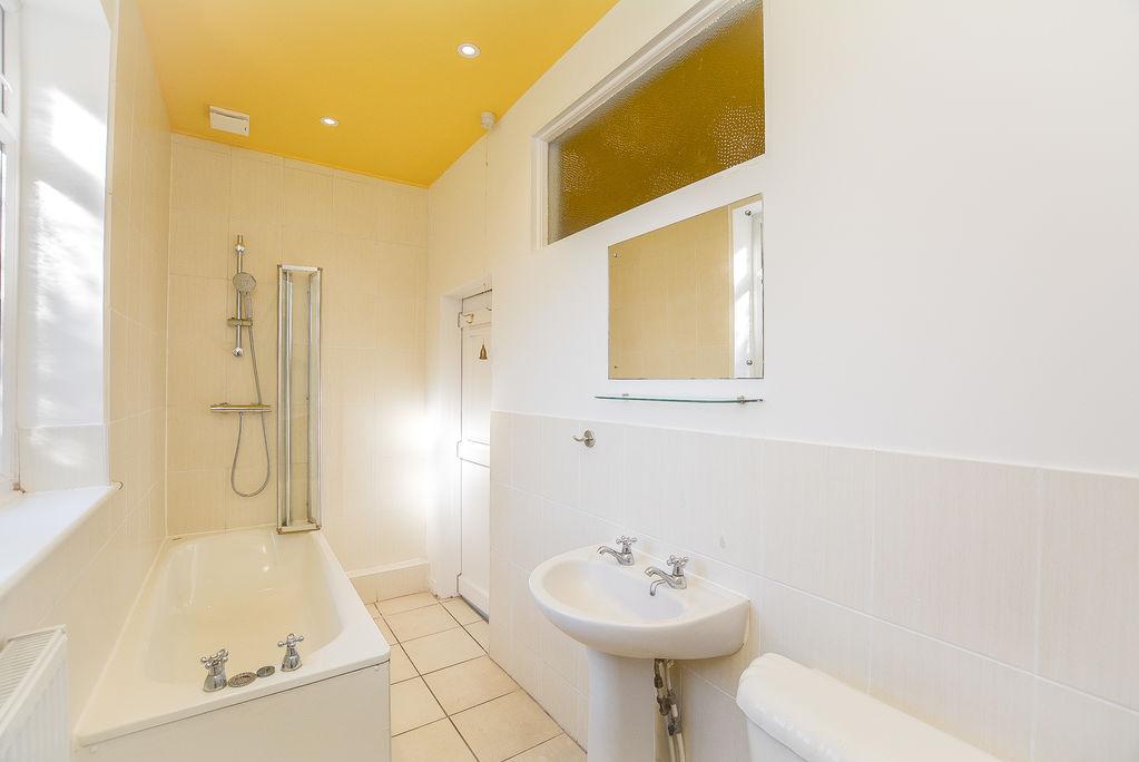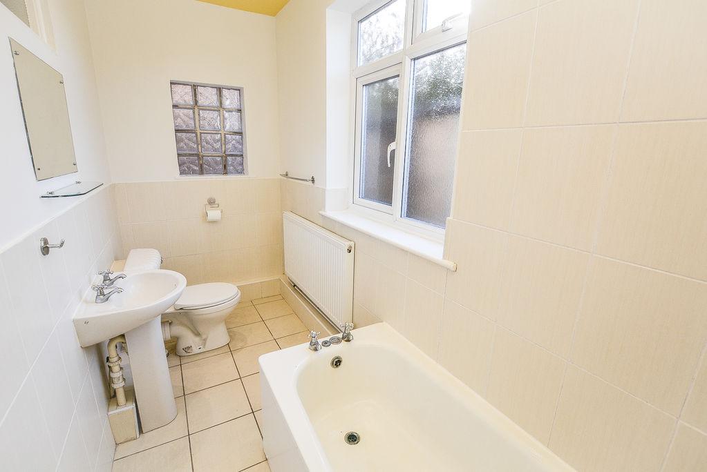 Accessed from the kitchen, you are welcomed into the bathroom. Comprised of a low level W/C, pedestal hand wash basin, paneled bath, wall mounted shower and folidng shower screen, this space is complete with tiled flooring and splashback wall tiling. Additional benefits include a wall mounted mirror, a fitted radiator and dual aspect lighting towards the side and rear elevation.