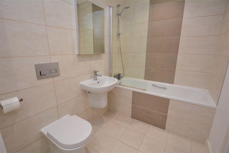 Modern suite comprising of a WC, wash hand basin and panelled bath with a fitted shower. Heated towel rail, tiled walls, floor and plastered ceiling with recessed spot lighting. Built-in airing cupboard housing tank and plumbing for a washing machine.