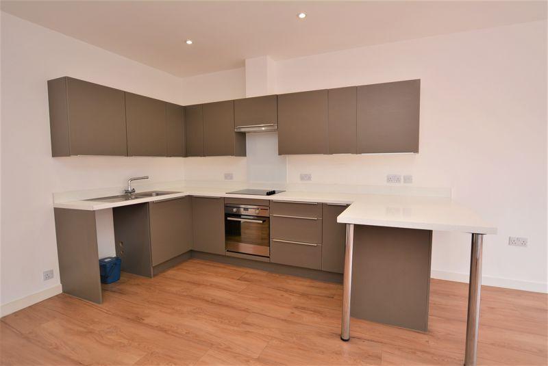 Modern selection of base and drawer units with an integrated oven. Complimentary worktop with inset hob, sink and matching breakfast bar. Further selection of matching eye level units with an extractor fan. Wood effect flooring and plastered ceiling with recessed spot lighting. Panelled doors leading to the...