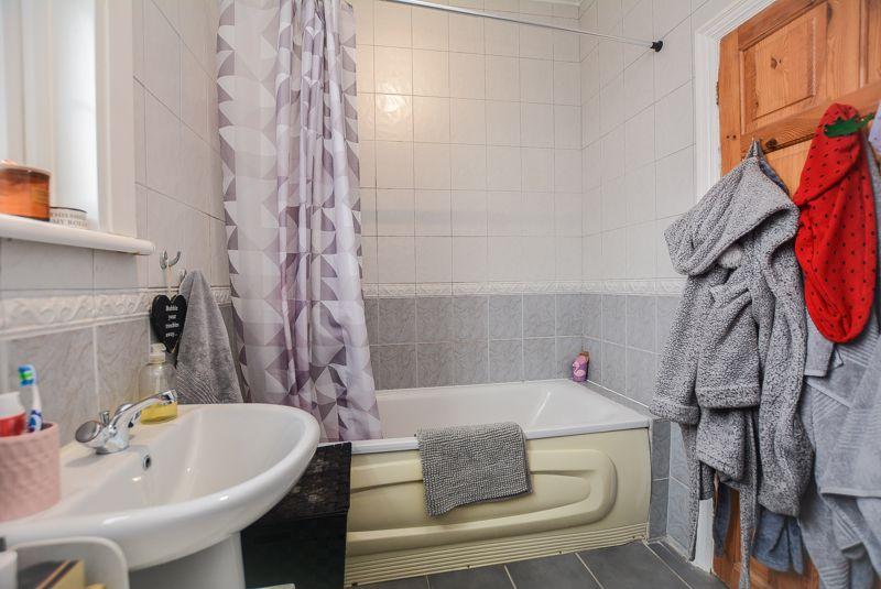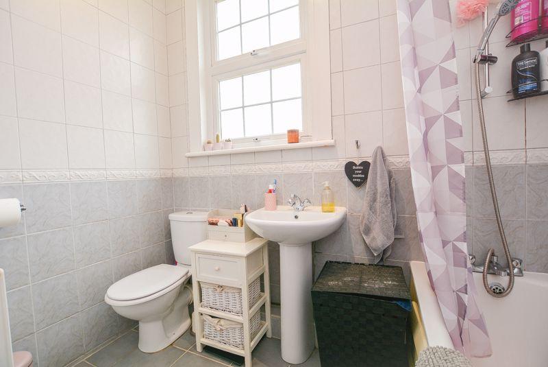 Accessed via the first floor landing, there is a bathroom suite. Comprised of a low level W/C, pedestal hand wash basin and paneled bath with wall mounted shower, added benefits of this space include a fitted radiator as well as a window towards the rear elevation of the property. Finished with tiled flooring and splashback wall tiling.