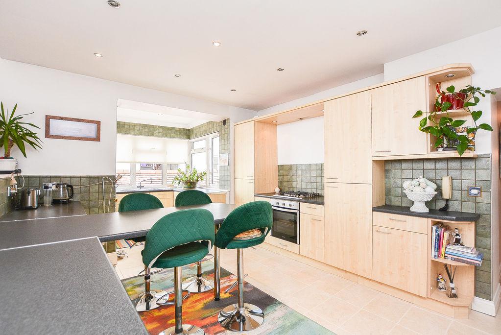From an open doorway, accessed via the entrance hallway, you are guided into a bright and generously sized kitchen. Comprised of both eye level and low level units, this space offers ample storage whilst housing integrated amenities such as a fridge, freezer, dishwasher and washing machine, whilst benefiting from two inset sinks, a hob and an oven. Made complete with a breakfast bar for intimate dining, this space is finished with tiled flooring, splashback wall tiling and recessed spot lighting, whilst enjoying the additional benefit of a double glazed bay window towards the side elevation, a fitted radiator and decorative radiator cover. From here, there is are a few steps that seamlessly transition into the lounge.