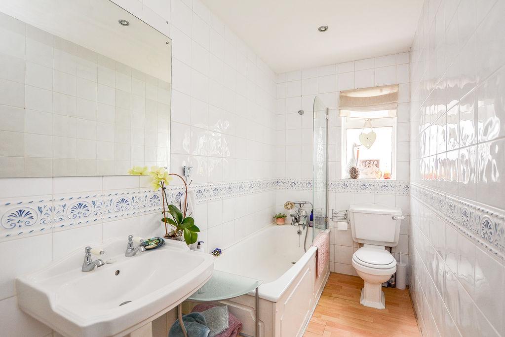 Accessed from the entrance hallway, there is a three piece bathroom. Comprised of a low level W/C, a paneled bath, wall mounted shower, shower screen and pedestal hand wash basin, this space benefits from a wall mounted mirror, a double glazed, obscured window towards the side elevation and fitted radiator. Finished with wood effect flooring, tiled walls and recessed spot lighting.