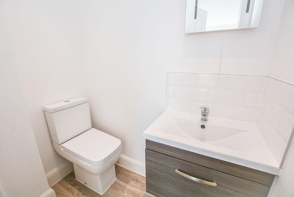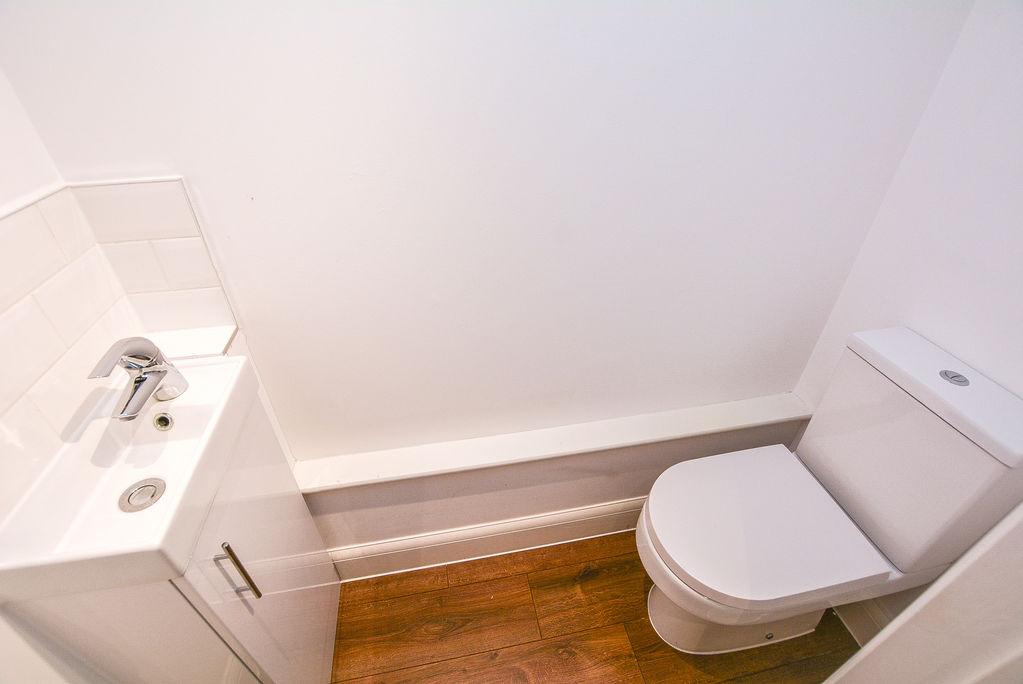 Accessed via the entrance hallway, there is a built in under the stairs W/C. With a fantastically modern finish, this space boasts a low level W/C and wall mounted sink with vanity unit and partial splashback tiling. This space is finished with wood effect flooring.