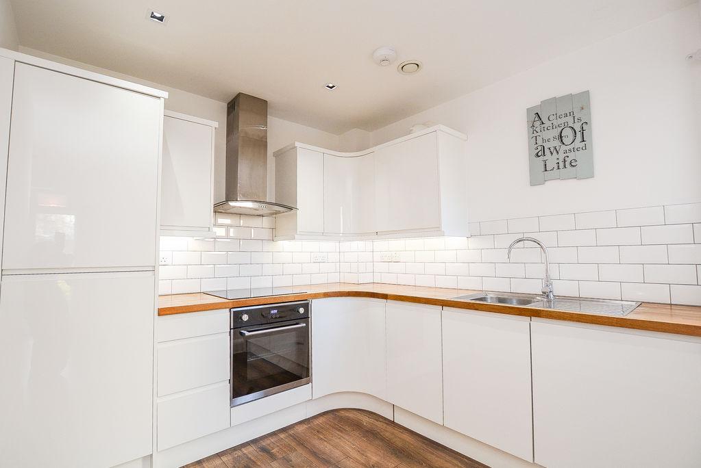 The kitchen is comprised of both eye level and low level units, housing amenities such as an inset oven paired with an overhead extractor, inset fridge-freezer and sink. With a modern finish, this space boasts splashback wall tiling, wood effect flooring and recessed spot lighting. Added benefits include a window towards the rear elevation of the property, allowing natural light to illuminate.