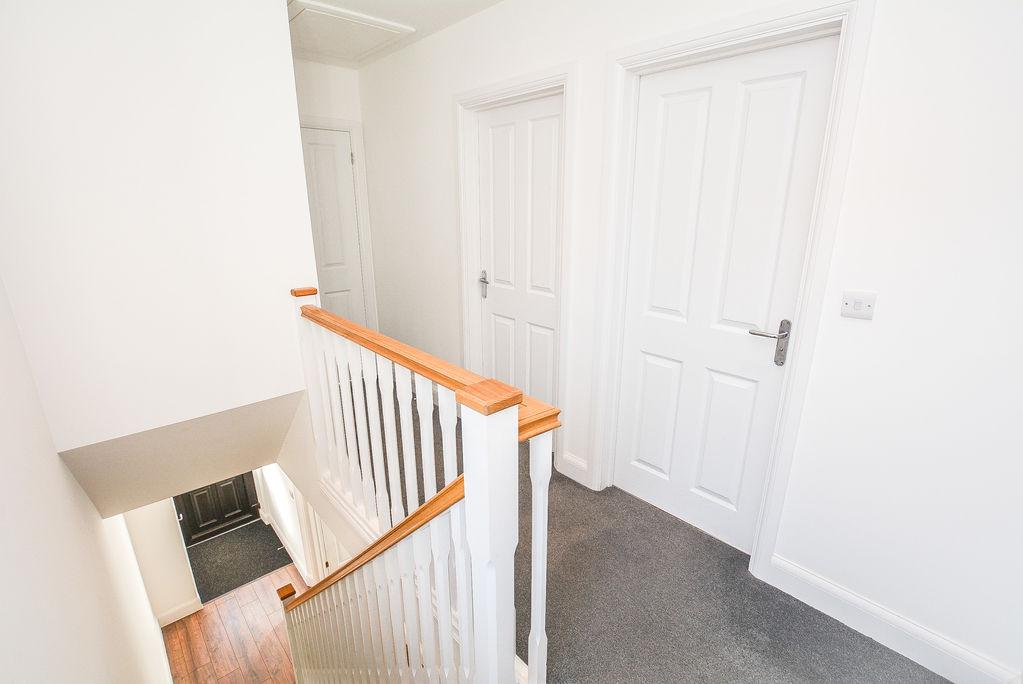 At the top of the rising staircase, there is a landing that provides access to all bedrooms and the family bathroom. Finished with carpeted flooring, this space features a window to the side elevation of the property, allowing ample natural light, as well as recessed spot lighting.
