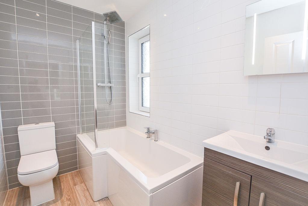From the first floor landing, there is a family bathroom comprised of a low level w/c, a paneled bath paired with a wall mounted shower and shower screen as well as a wall mounted sink with vanity unit. Finished with wood effect flooring and splashback wall tiling, this space boasts recessed spot lighting as well as a wall mounted storage unit paired with a wall mounted mirror.