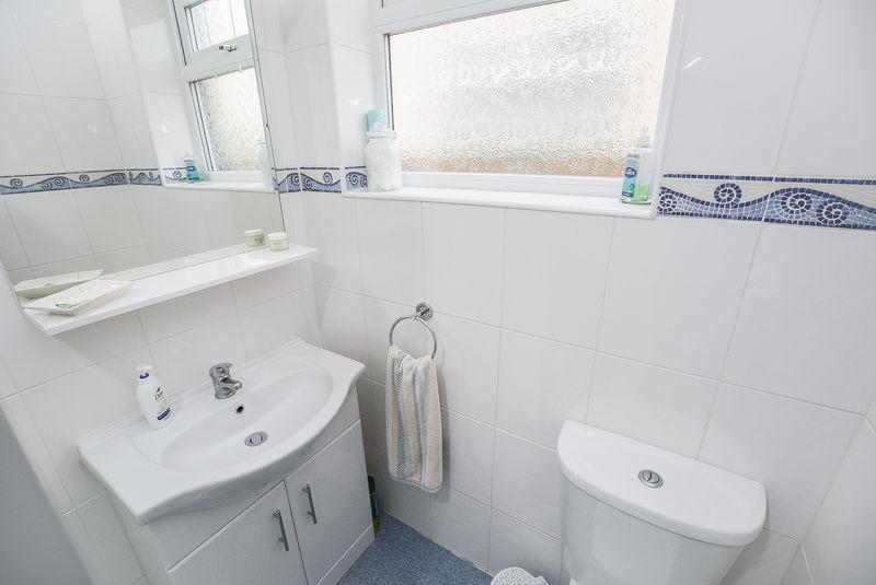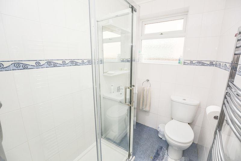 Accessed from the entrance hallway, there is a modern shower room. Equipped with a large shower cubicle, sink paired with vanity unit and low level W/C, this space is complete with tiled walls, a heated towel rail, wall mounted mirror unit, built in storage cupboard and obscured, double glazed window towards the side elevation.