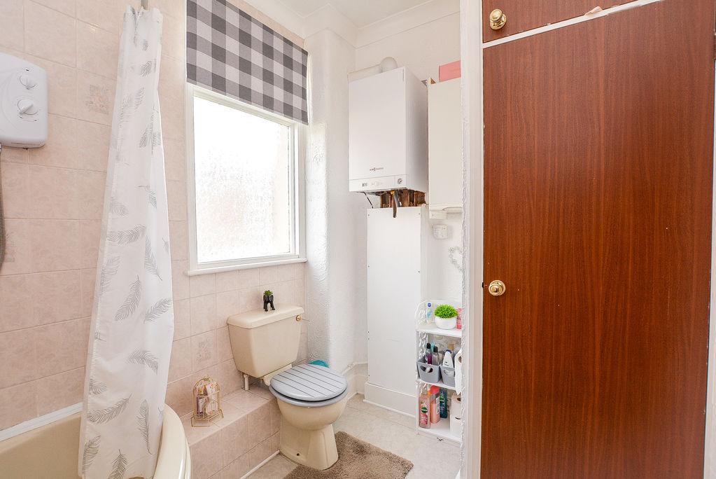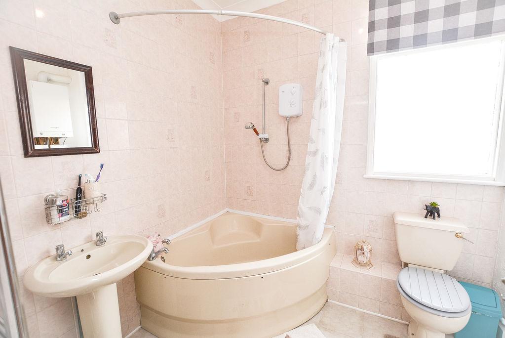 Accessed from the first floor landing, there is a three peice bathroom. Comprised of a corner bath, wall mounted shower, shower curtain, pedestal hand wash basin and W/C, this space benefits from a wall mounted mirror and a built in storage cupboard. Complete with a heated towel rail and double glazed, obscured window towards the rear elevation.