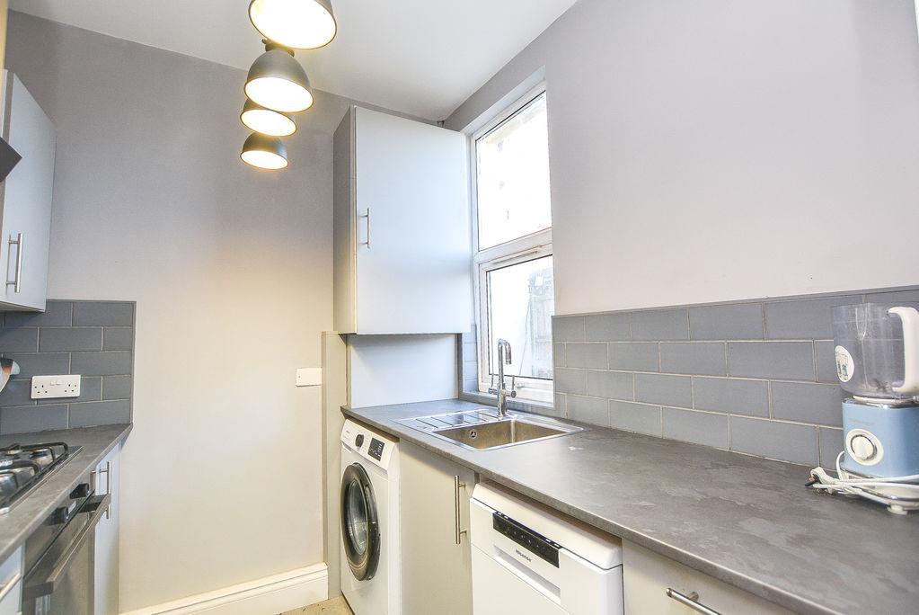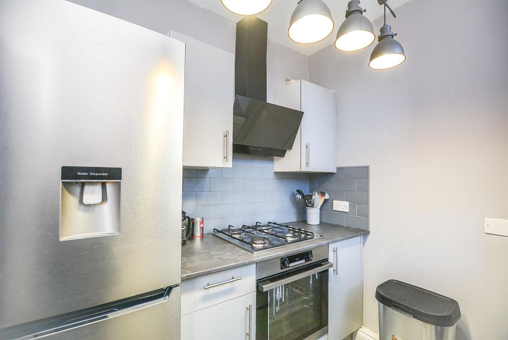 Accessed from the dining room, there is a modern kitchen. With both eye level and low level storage units, this space houses amenities such as an inset oven, hob, extractor and sink, whilst providing plumbing space for utilities. Finished with splashback wall tiling, tiled flooring and a double glazed window towards the side elevation.