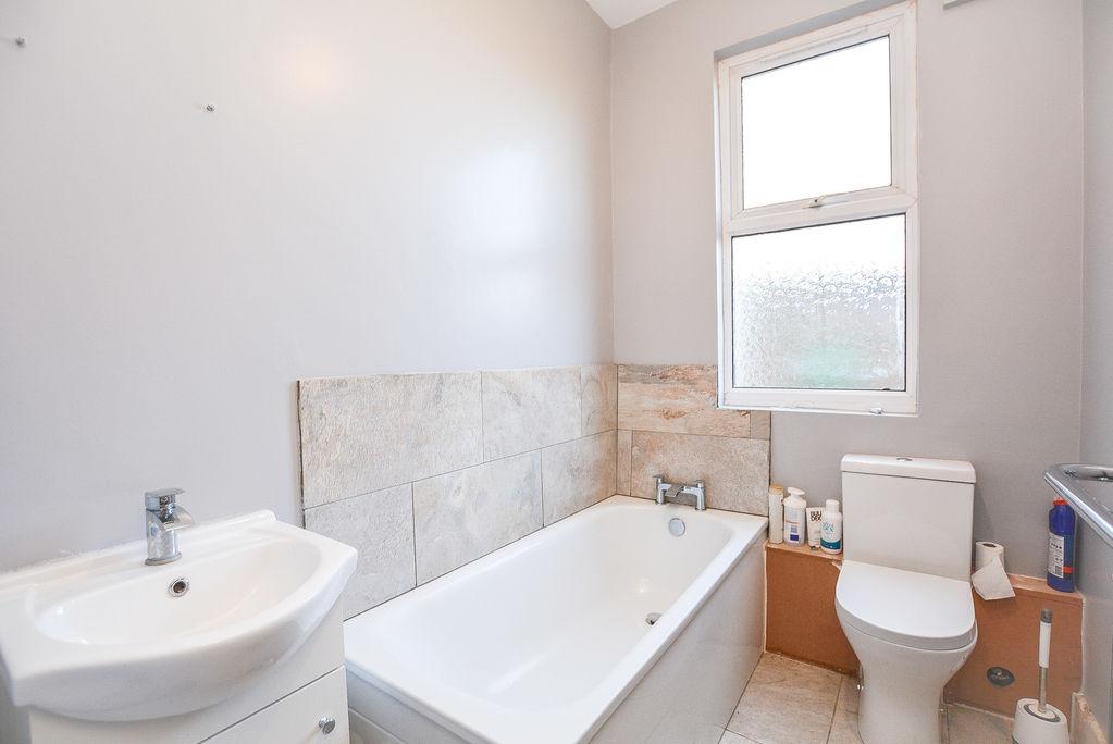 Accessed from the entrance hallway, there is a three piece bathroom. Comprised of a low level W/C, a hand wash basin with vanity unit and a paneled bath, this space is finished with tiled flooring, splashback wall tiling, a double glazed, obscured window towards the side elevation and a fitted radiator.